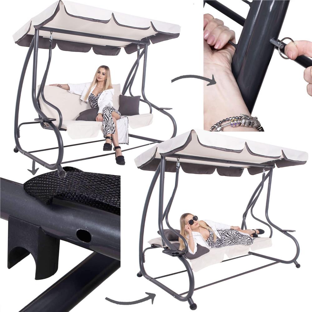 Balansoar de gradina 3 locuri cu cadru din otel vopsit in pulbere, vizor reglabil si functie de pliere in pozitie culcat (tip pat). Perne confortabile, materiale impermeabile si stabilitate excelenta – ideal pentru terasa sau curte.
