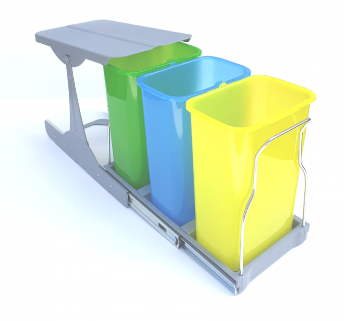 Sistem cosuri gunoi pentru colectare selectiva – 3x8 L. Set compact cu 3 recipiente (8 L fiecare) si tavita suport pentru stabilitate. Glisare manuala, silentioasa, cu tren de role si deschidere partiala. Complet demontabil pentru curatare rapida (recipientele si tavita se spala usor).