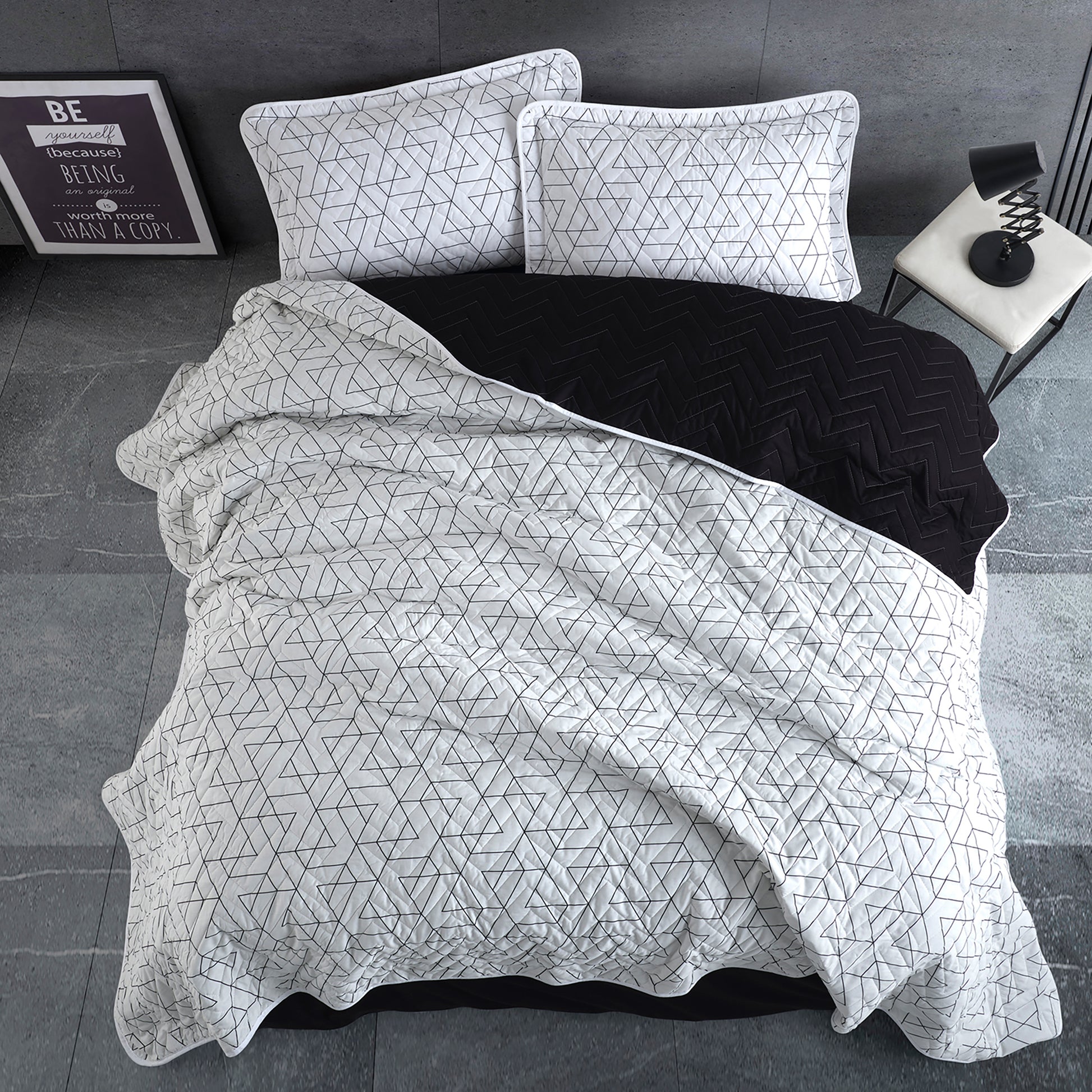 Cuvertura pat Clasy, matlasata, 2 persoane – 240x260 cm + 2 fete 50x70 cm. Cuvertura reversibila cu design geometric minimalist (linii negre pe fundal neutru), potrivita dormitoarelor moderne sau nordice. Tesatura naturala, respirabila, cu matlasare stabila care isi pastreaza forma in timp.